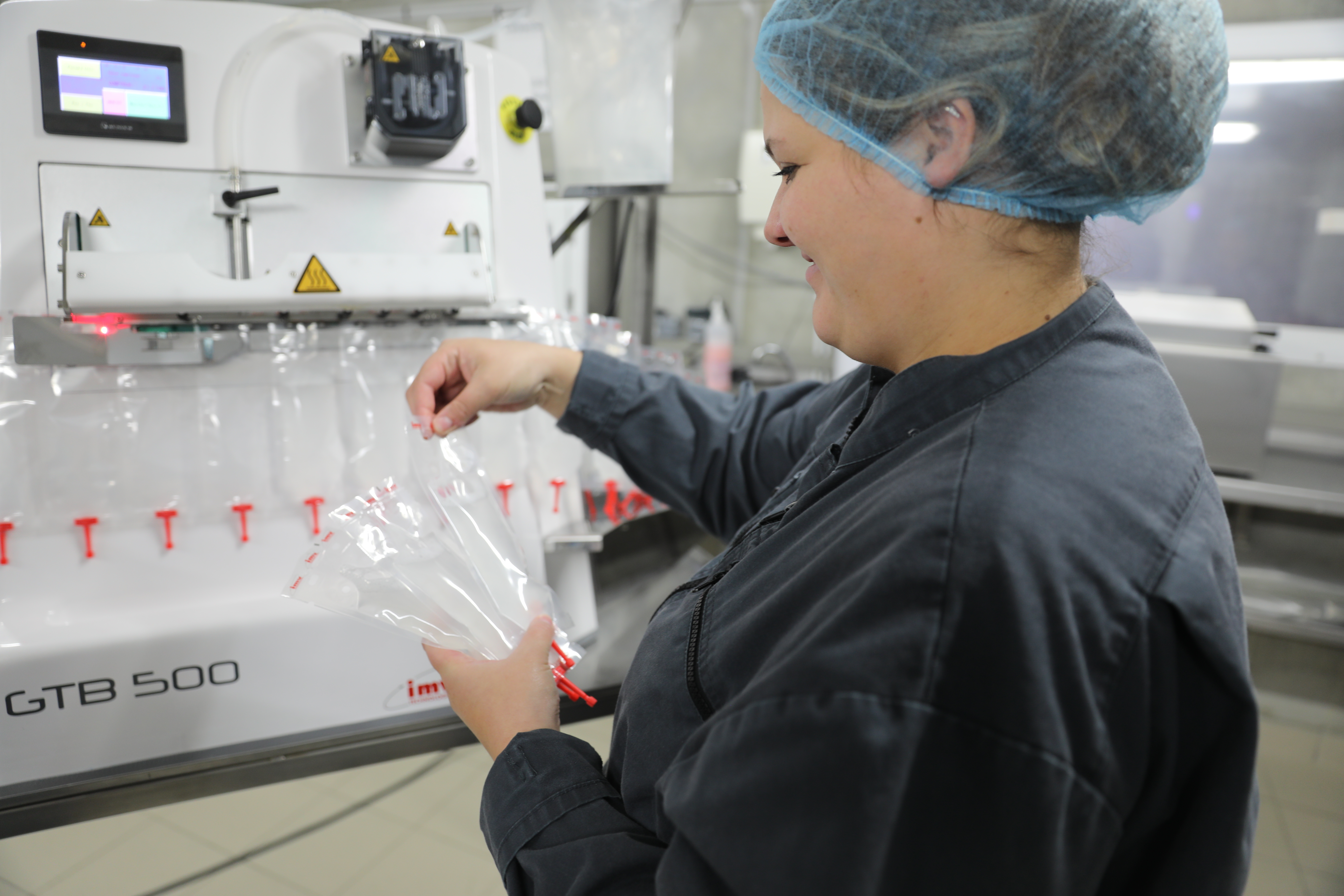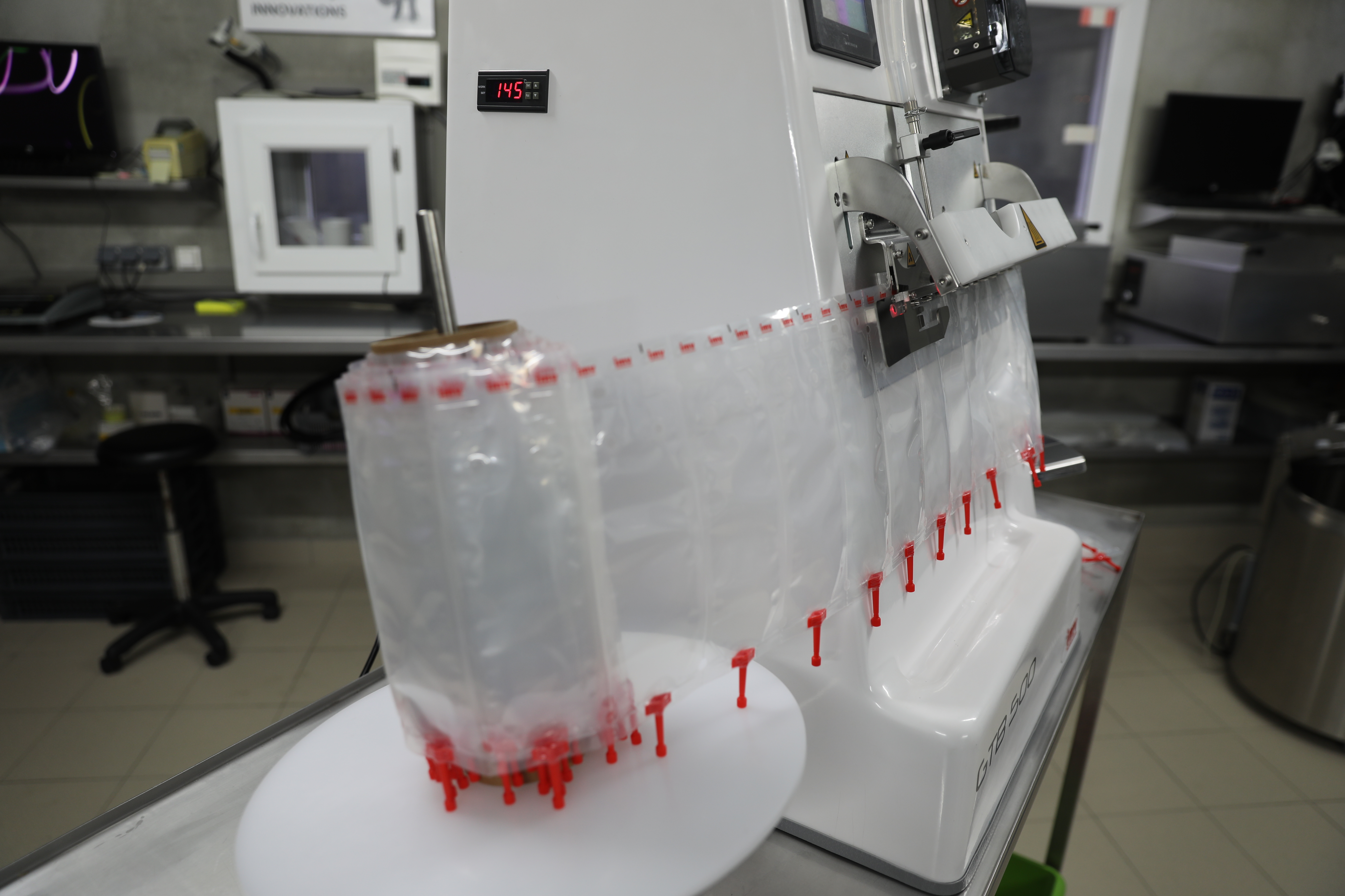 Ele opera com bolsas Crystal (IMV Technologies) e realiza o envase de até 90 mL por blister. No volume máximo, recomenda-se reduzir a velocidade da máquina para limitar a formação de espuma.